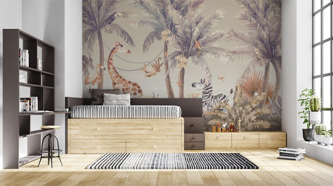 [Fototapeta do pokoju dziecięcego]: Wybierz wytrzymałą fototapetę winylową z ulubionymi motywami dziecka – jest łatwa w czyszczeniu i odporna na uszkodzenia.