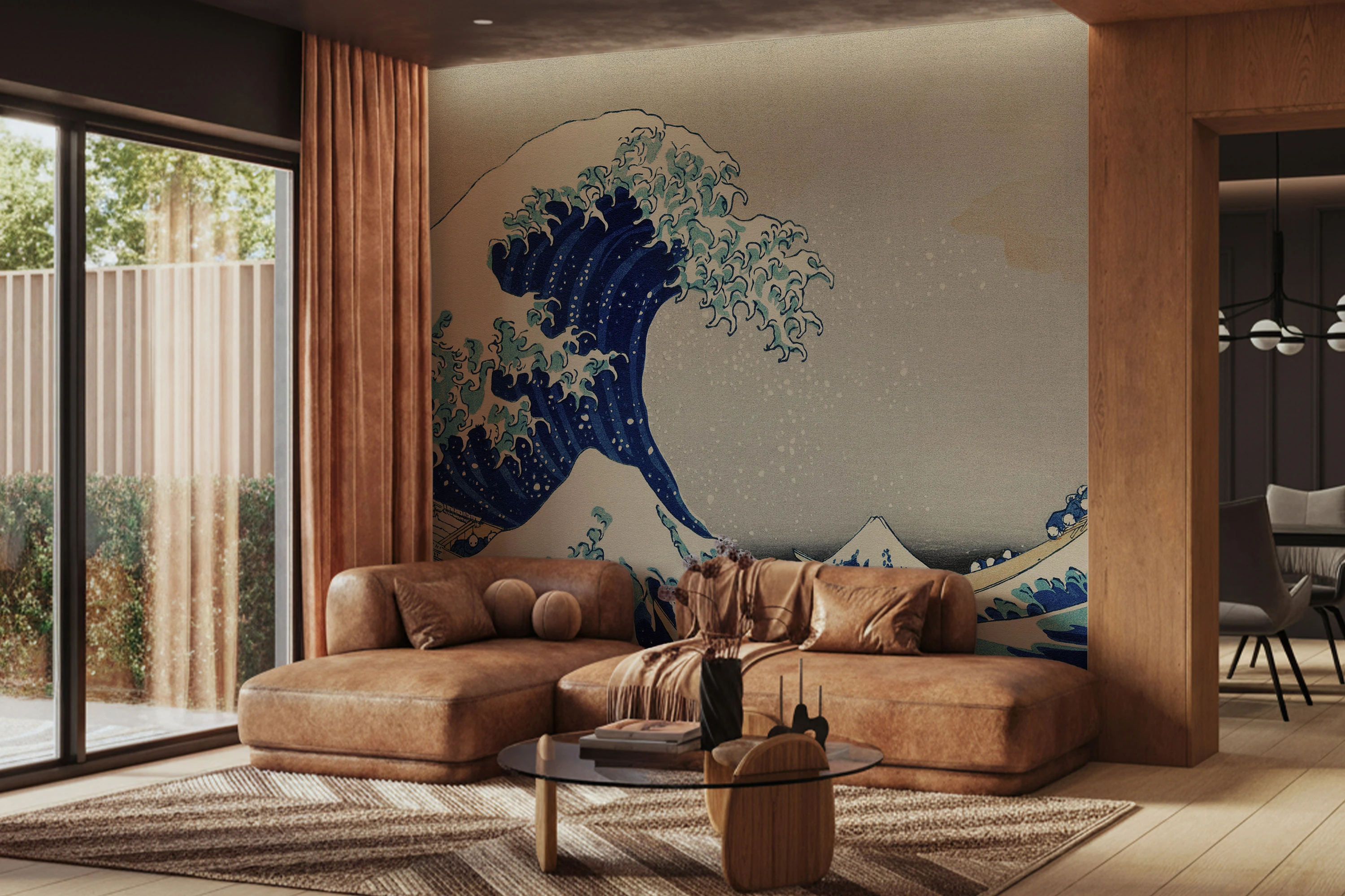 Ilustracja ukazuje monumentalną falę unoszącą się nad spokojnym horyzontem, tworząc dynamiczną i pełną napięcia scenę inspirowaną klasyczną sztuką japońską. Rytmiczne linie wody, kontrastujące z delikatnym tłem nieba, budują wrażenie ruchu i potęgi natury. Kompozycja łączy harmonię z dramatyzmem, oddając piękno i siłę oceanu. Fototapeta wprowadza do wnętrza wyrazisty akcent artystyczny, podkreślając charakter nowoczesnych, minimalistycznych i eleganckich aranżacji.