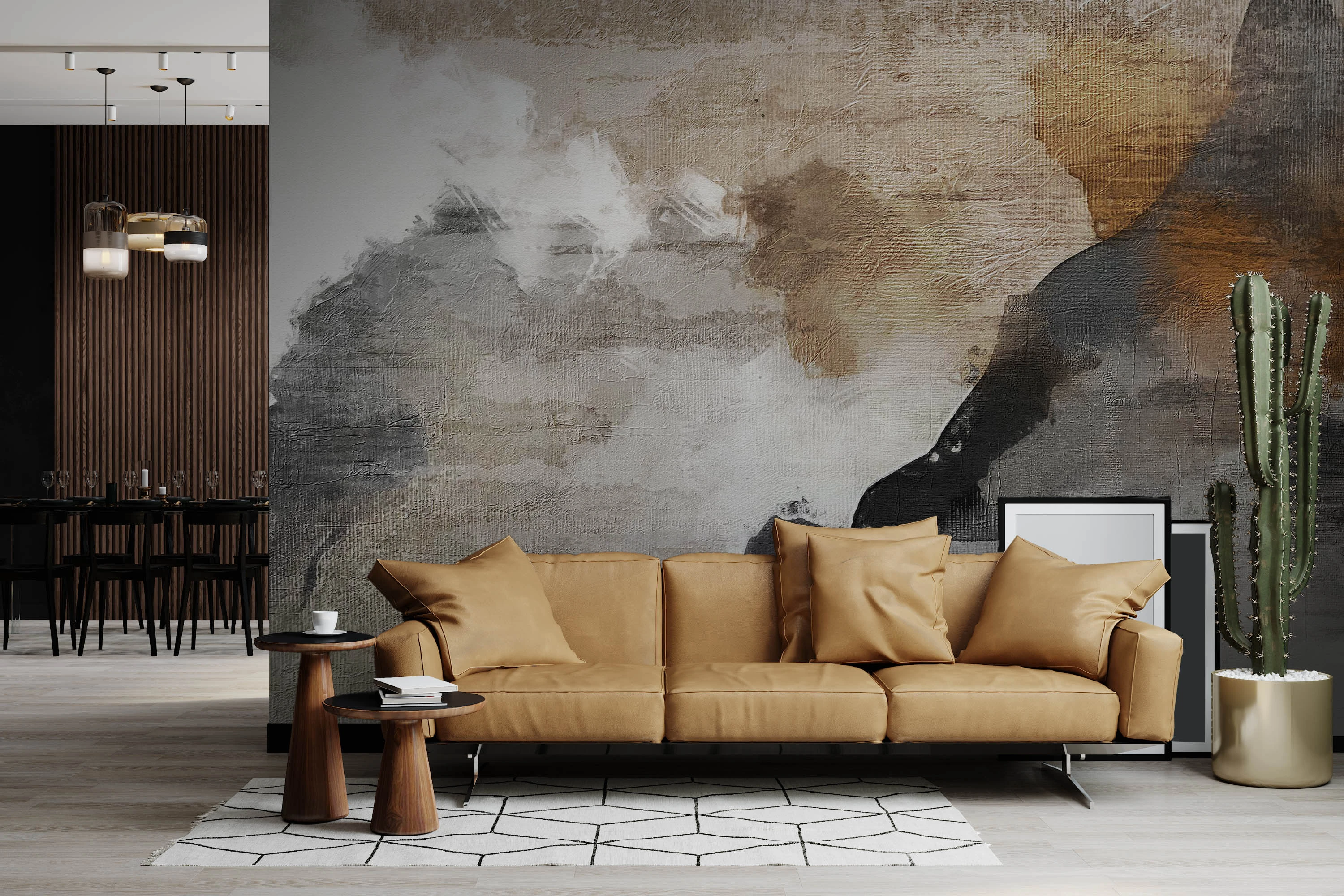 Ilustracja przedstawia abstrakcyjną kompozycję o surowym, malarskim charakterze, w której warstwy farby przenikają się niczym ślady emocji zapisane na płótnie. Kontrast jasnych i ciemnych plam buduje głębię oraz wrażenie ruchu, zachowując jednocześnie atmosferę spokoju i wyciszenia. Widoczna faktura przypomina ręczne pociągnięcia pędzla i naturalne przetarcia, nadając całości autentyczności. Dominują odcienie złamanej bieli, szarości, grafitu oraz ciepłego brązu i ochry. Fototapeta idealnie dopełni nowoczesne, minimalistyczne wnętrza, wprowadzając subtelną elegancję.