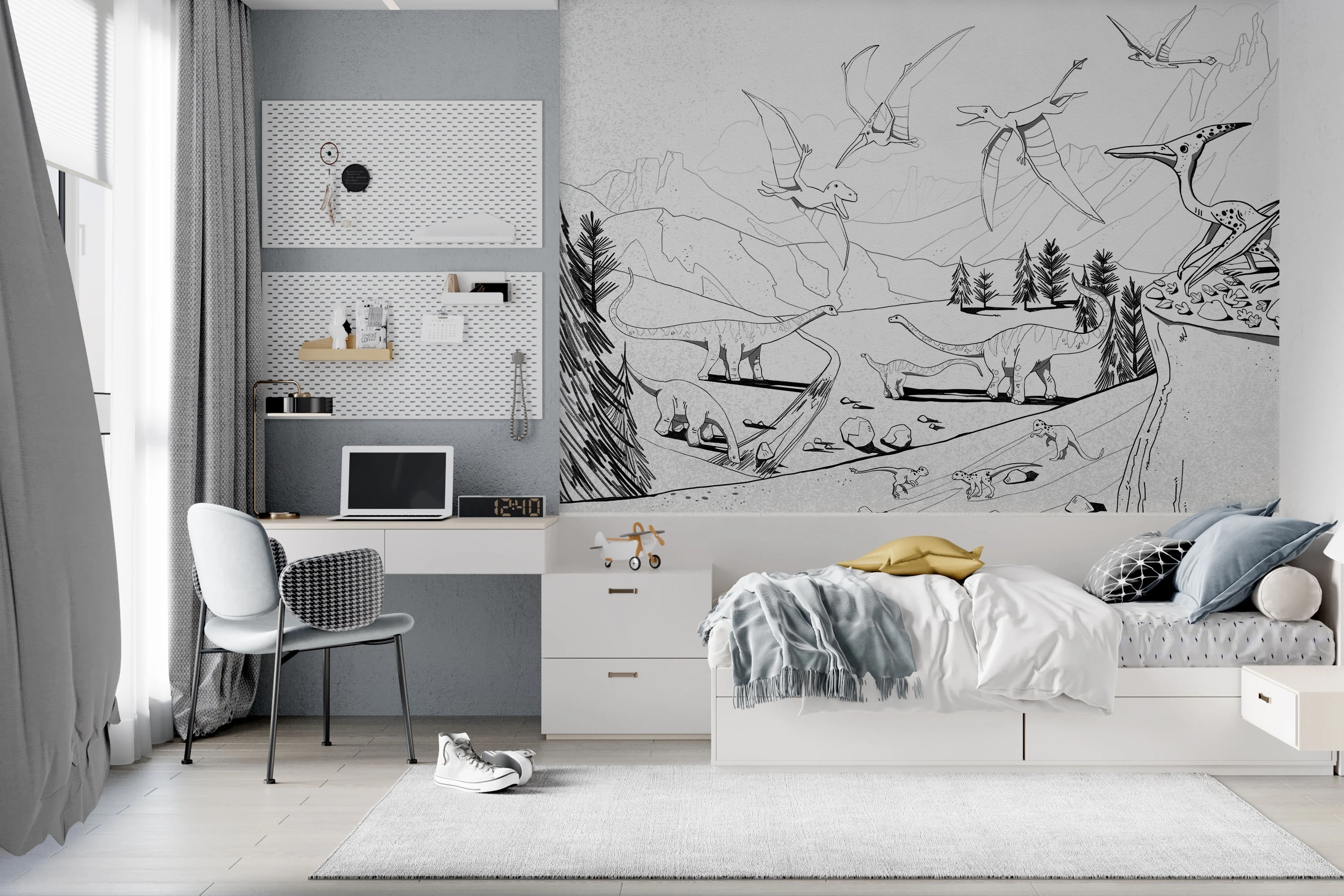 Ilustracja przedstawia rozległą, prehistoryczną scenę pełną dinozaurów i latających gadów unoszących się nad górskim krajobrazem. Rysunkowy styl oparty na delikatnej kresce nadaje kompozycji lekkości i czytelności, a liczne detale zachęcają do odkrywania kolejnych elementów świata sprzed milionów lat. Harmonijne połączenie krajobrazu, roślinności i zwierząt tworzy narracyjną całość o edukacyjnym charakterze. Fototapeta pobudza wyobraźnię, wspiera ciekawość poznawczą i doskonale sprawdzi się w przestrzeniach dziecięcych.
