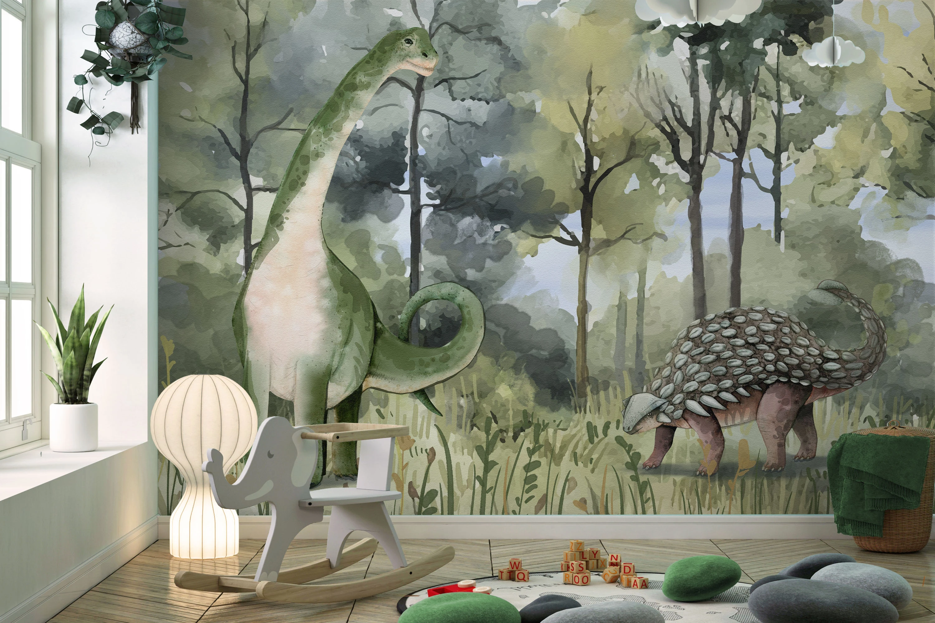Ilustracja przedstawia spokojną, bajkową scenę z prehistorycznego lasu, w której dwa dinozaury spotykają się pośród miękkiej zieleni i wysokich drzew. Delikatna akwarelowa stylistyka nadaje kompozycji lekkości i przyjaznego charakteru, a łagodne kształty oraz naturalne barwy budują atmosferę bezpieczeństwa i harmonii. Fototapeta przenosi do świata dziecięcej wyobraźni, wprowadzając do wnętrza ciepło, spokój i nutę edukacyjnej przygody inspirowanej naturą.