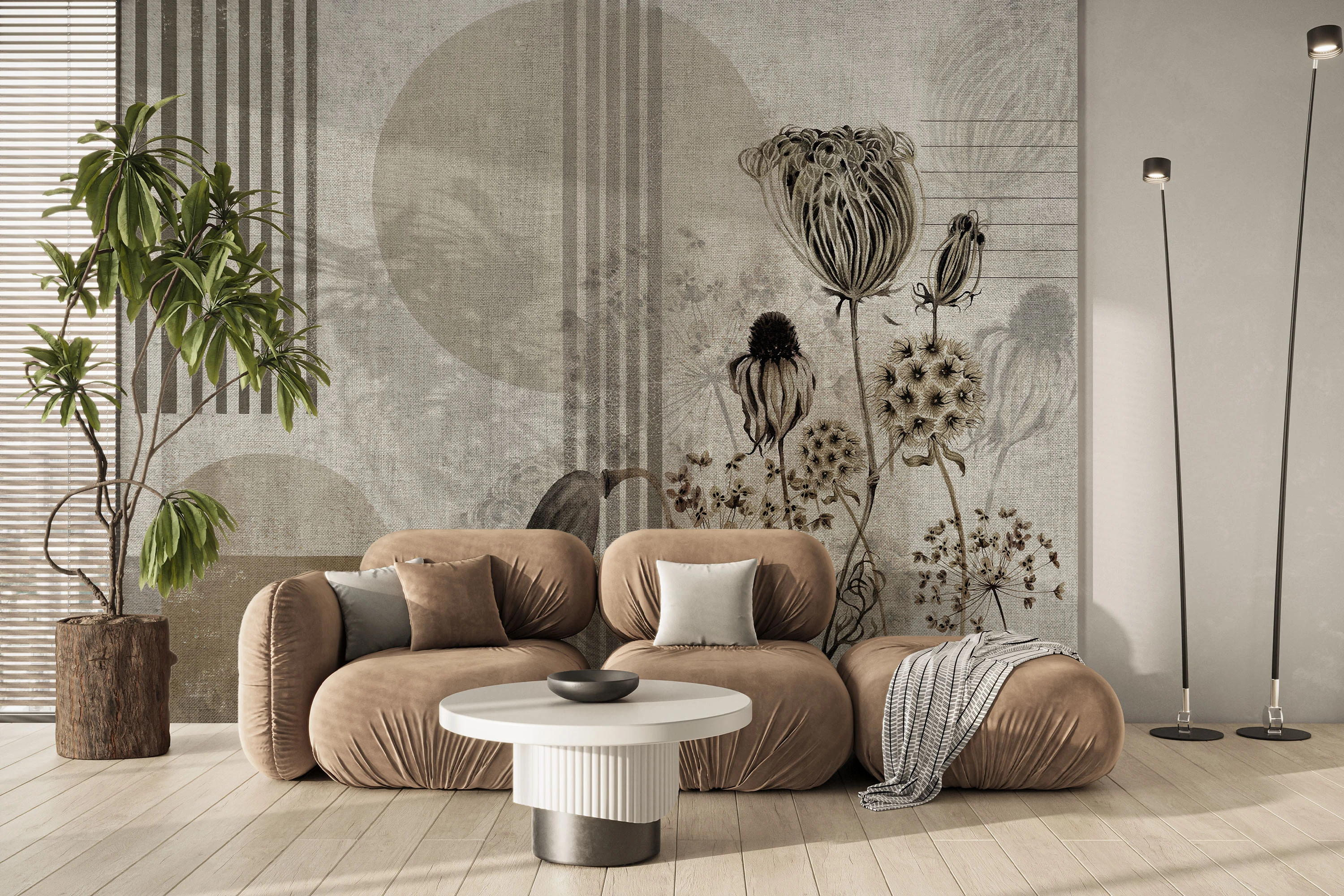 Ilustracja przedstawiająca subtelną kompozycję botaniczną inspirowaną suszonymi roślinami i naturalnymi fakturami tworzy spokojny, wyważony motyw o eleganckim charakterze. Delikatne kwiatostany zestawione z geometrycznymi formami i pionowymi liniami nadają całości nowoczesną strukturę, zachowując jednocześnie organiczną lekkość. Stonowana kolorystyka oraz efekt lnianej faktury wprowadzają do wnętrza harmonię, ciszę i ponadczasowy styl. Fototapeta doskonale sprawdzi się w salonie, sypialni lub gabinecie, podkreślając wnętrza w stylu naturalnym, japandi lub minimalistycznym.