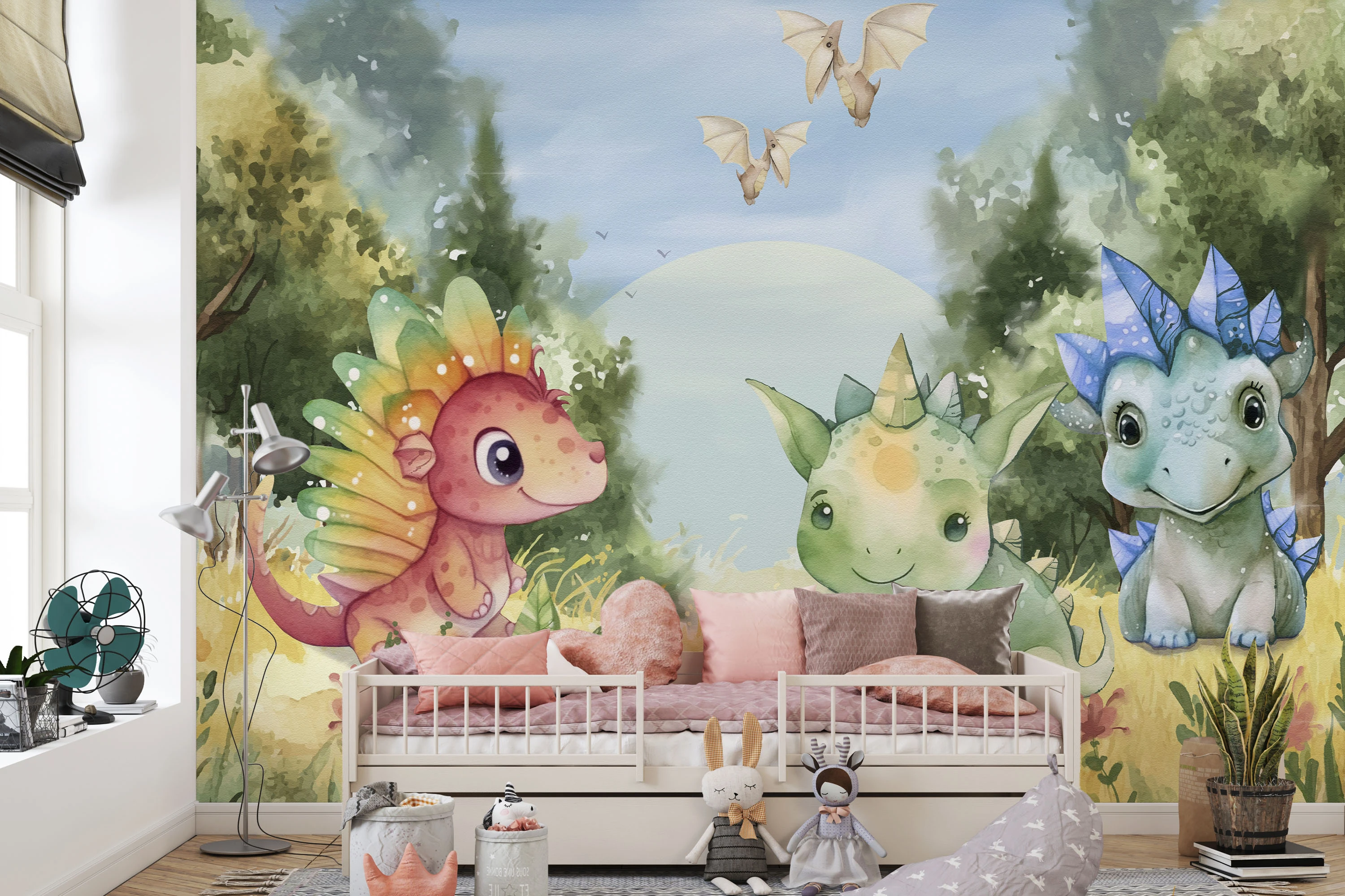 Ilustracja przedstawia urocze, bajkowe smoki odpoczywające na słonecznej polanie, otoczone zielonym lasem i delikatnymi kwiatami. Trzy sympatyczne postacie o dużych oczach i pastelowych barwach emanują radością, ciepłem i dziecięcą beztroską. Akwarelowa stylistyka nadaje scenie miękkości i lekkości, a harmonijna kompozycja pobudza wyobraźnię najmłodszych. Dominują odcienie zieleni, żółci i błękitu, uzupełnione pastelowym różem, pomarańczem i kremową bielą. Fototapeta tworzy przyjazną, magiczną atmosferę sprzyjającą zabawie i marzeniom.