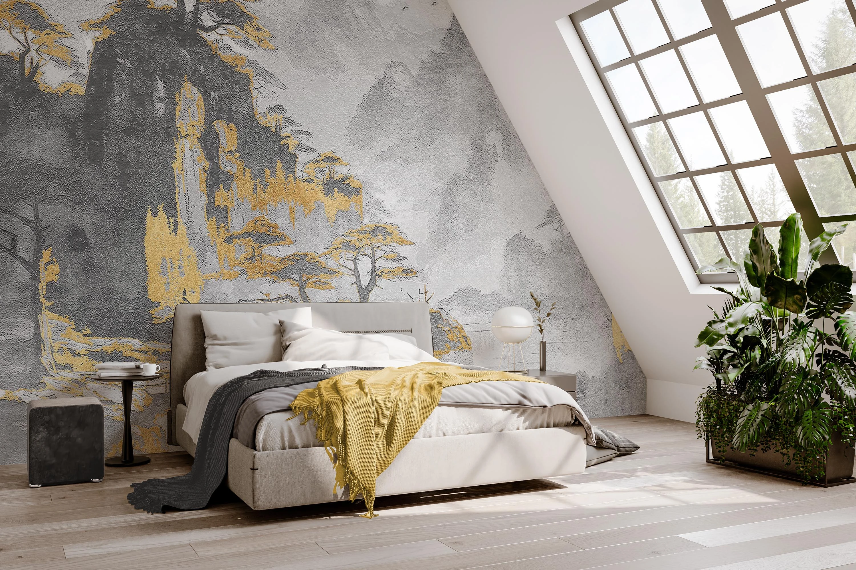 Ilustracja przedstawia nastrojowy, górski pejzaż inspirowany estetyką Dalekiego Wschodu, w którym monumentalne formy skał i drzew wyłaniają się z delikatnej mgły. Subtelna gra faktur oraz kontrast chłodnych szarości ze złotymi akcentami nadają kompozycji elegancji i głębi. Całość emanuje spokojem, równowagą i ponadczasowym charakterem. Fototapeta wprowadza do wnętrza atmosferę wyciszenia i luksusowej prostoty, idealnie komponując się z nowoczesnymi i minimalistycznymi aranżacjami.