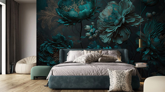• Dlaczego warto? Zamiast drobnej łączki, wybierz duże kwiaty w formacie XXL. Ogromne, szafirowe piwonie czy herbaciane róże na czarnym lub butelkowozielonym tle wyglądają jak holenderskie obrazy z XVII wieku. Taka ściana za łóżkiem staje się prawdziwym dziełem sztuki i nie wymaga już żadnych dodatkowych ozdób (obrazów czy plakatów).