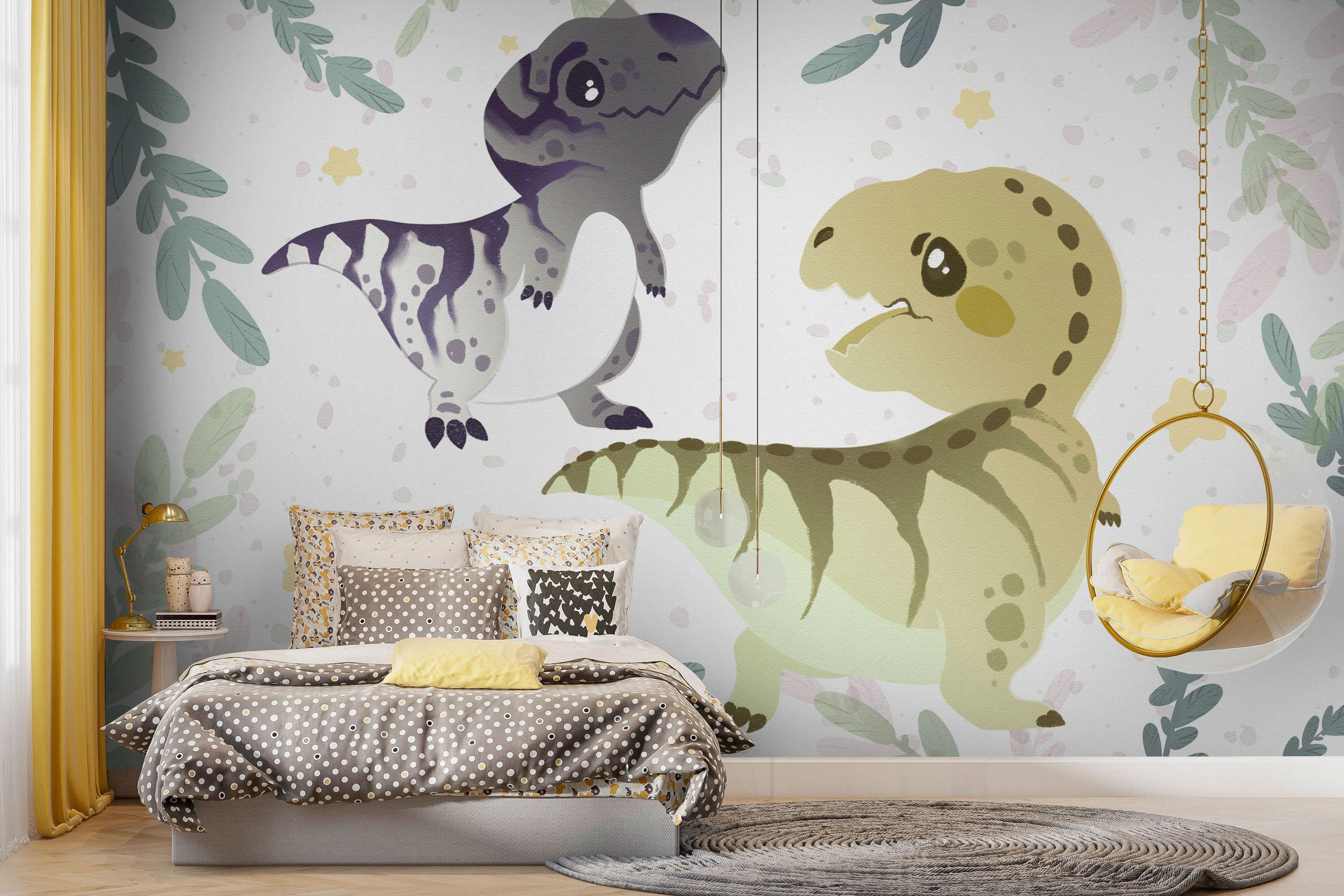 Ilustracja przedstawiająca dwa urocze dinozaury w pastelowej stylistyce tworzy pogodny, dziecięcy motyw pełen ciepła i spokoju. Delikatne listki układające się w ramę, drobne gwiazdki oraz subtelne plamki tła nadają kompozycji lekkości i bajkowego uroku. Przyjazne postacie o miękkich kształtach budują poczucie bezpieczeństwa, a jasna kolorystyka sprzyja wyciszeniu i odpoczynkowi. Fototapeta świetnie sprawdzi się w pokoju dziecka lub niemowlęcia, tworząc przytulną przestrzeń do zabawy, snu i rozwijania wyobraźni.