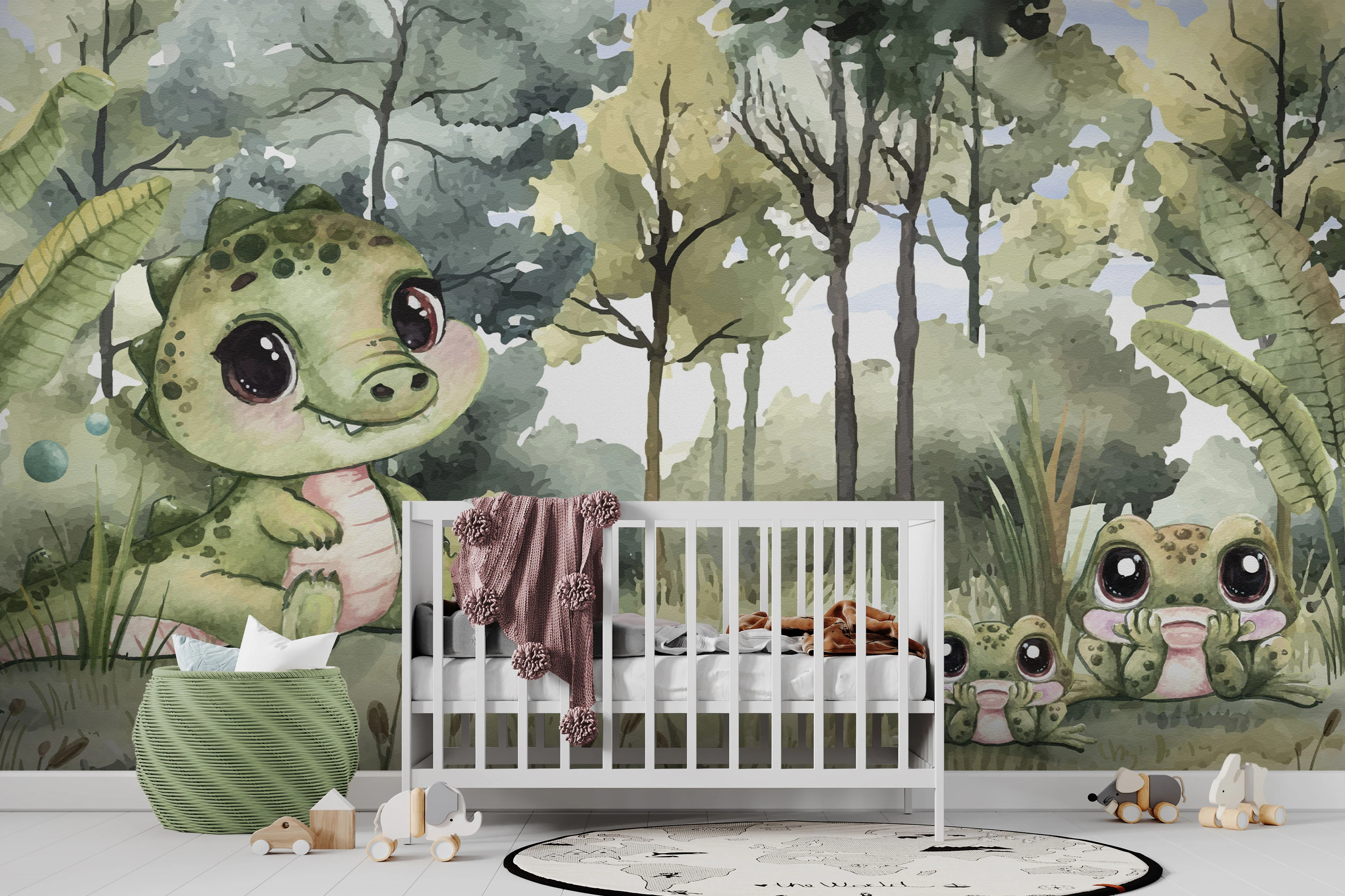 Ilustracja przedstawia urocze, bajkowe dinozaury odpoczywające w zielonym, leśnym otoczeniu pełnym miękkich kształtów i delikatnych detali. Akwarelowy styl oraz pastelowa kolorystyka nadają scenie lekkości i dziecięcej radości, tworząc przyjazną, bezpieczną atmosferę. Subtelne drzewa i roślinność budują spokojne tło, które pobudza wyobraźnię i zachęca do odkrywania świata. Fototapeta doskonale sprawdzi się w pokoju dziecka, wprowadzając ciepło, harmonię i nutę bajkowej magii.