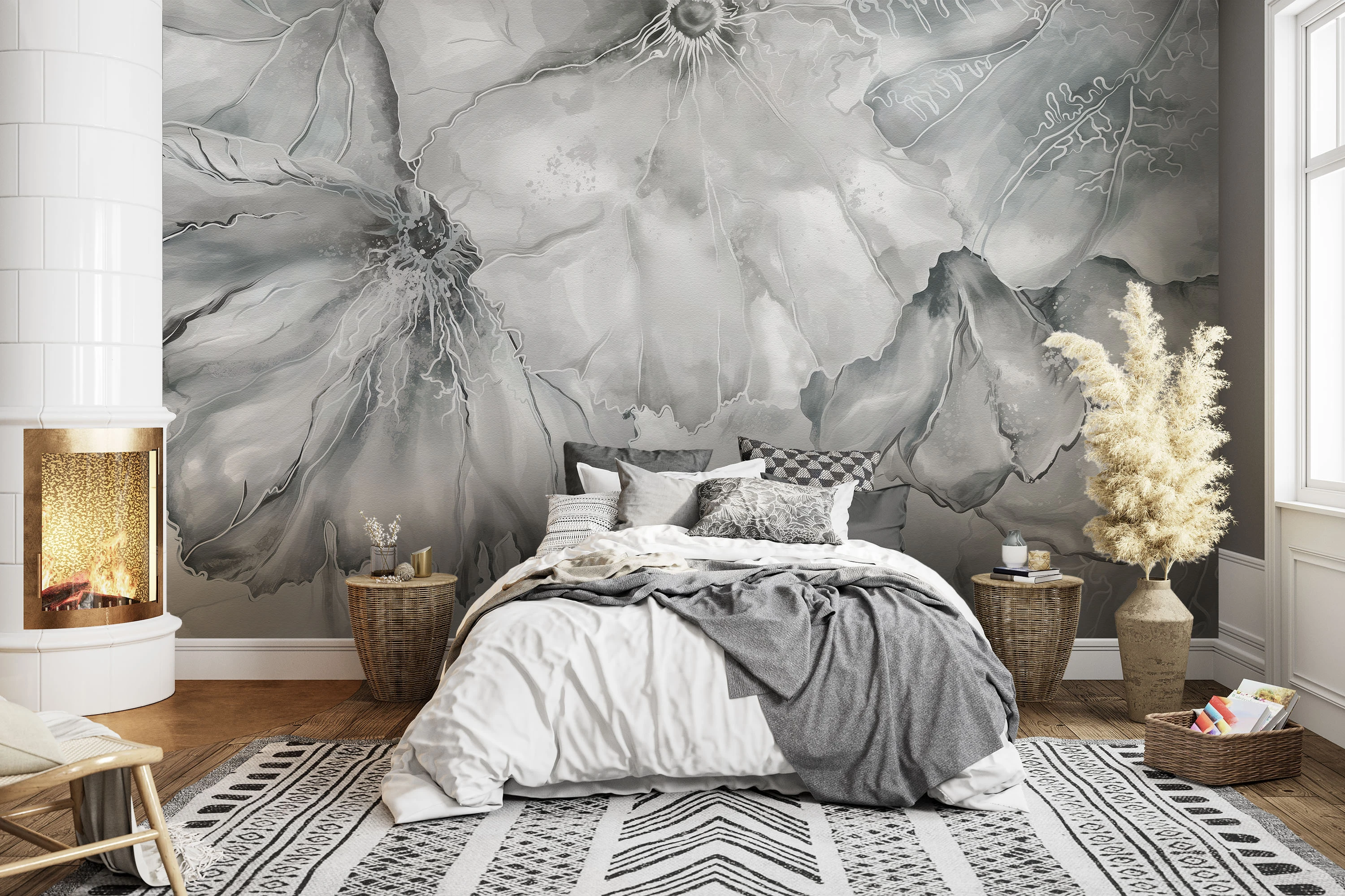 Ilustracja ukazuje monumentalne, abstrakcyjne kwiaty w chłodnej, szlachetnej palecie barw, przypominające delikatny rysunek tuszem i akwarelą. Miękkie przejścia tonalne, półprzezroczyste płatki oraz subtelne linie nadają kompozycji lekkości i elegancji. Całość emanuje spokojem i harmonią, tworząc wrażenie luksusowej prostoty. Fototapeta doskonale dopełnia wnętrza nowoczesne i klasyczne, wprowadzając atmosferę wyciszenia, światła oraz ponadczasowego piękna inspirowanego naturą.