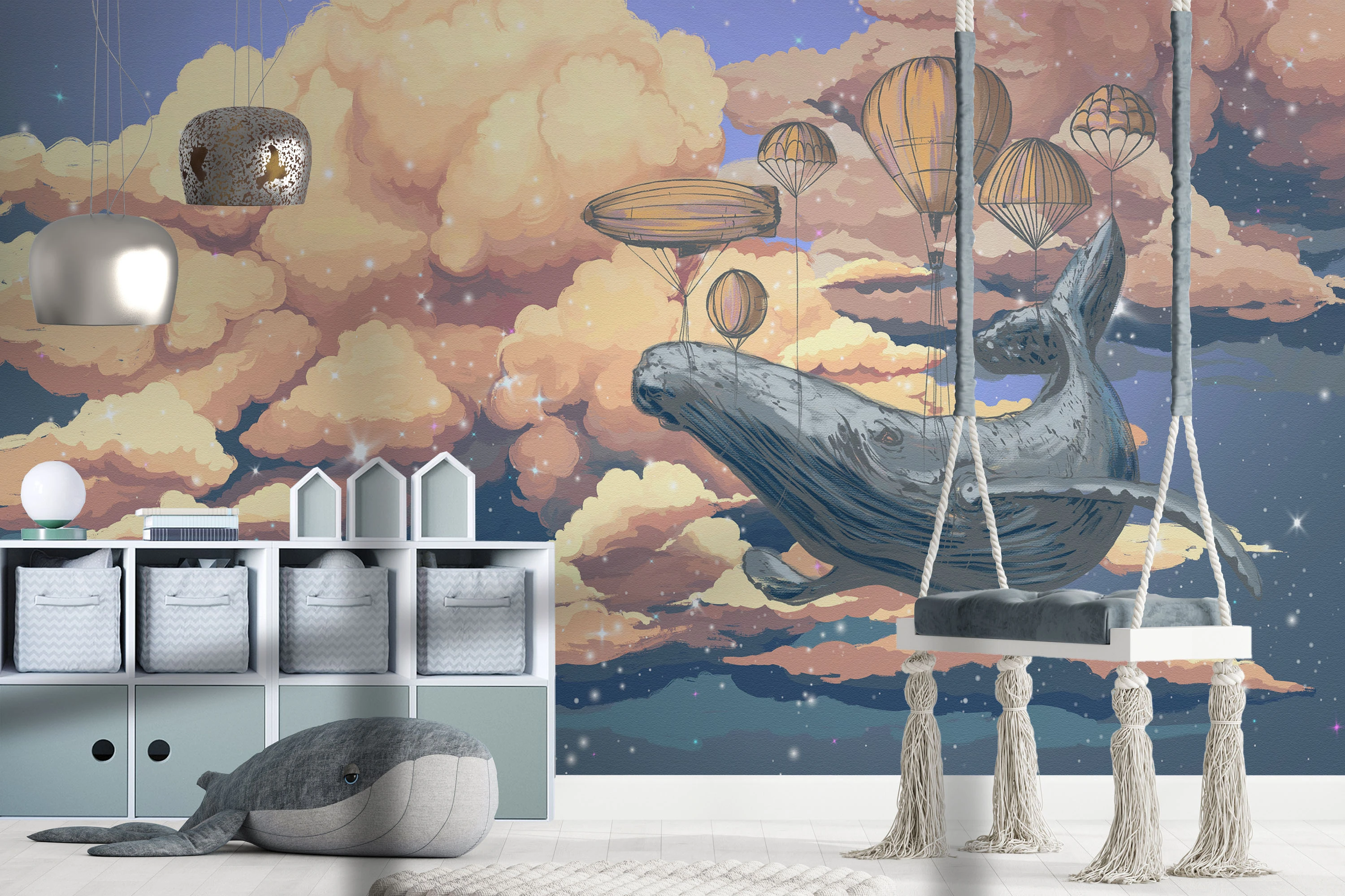 Ilustracja przedstawiająca majestatycznego wieloryba unoszącego się wśród miękkich, rozświetlonych chmur tworzy baśniową i oniryczną scenę pełną magii oraz spokoju. Delikatne balony unoszące zwierzę, pastelowe obłoki i migoczące gwiazdy budują atmosferę snu i dziecięcej wyobraźni. Subtelna kolorystyka oraz malarski styl nadają kompozycji lekkość i poetycki charakter. Fototapeta doskonale sprawdzi się w pokoju dziecka lub przestrzeni relaksu, wprowadzając uczucie marzeń, ciszy i oderwania od codzienności.