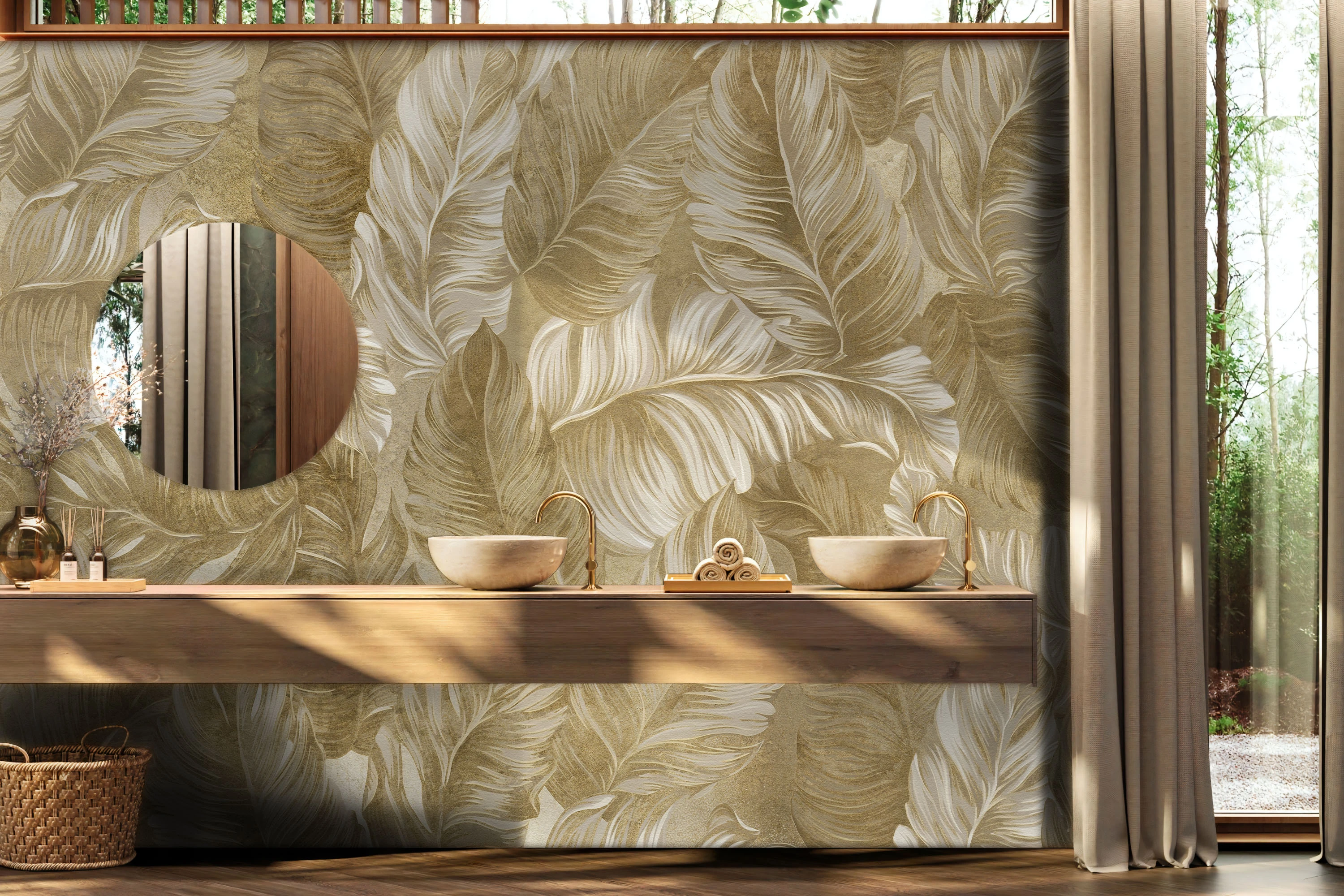 Obraz przedstawia dekoracyjny wzór złożony z dużych, stylizowanych liści w odcieniach złota i beżu. Liście układają się warstwowo, tworząc elegancką, pełną dynamiki kompozycję, w której połysk i cieniowanie nadają im niemal trójwymiarowy charakter. Całość emanuje luksusem i egzotycznym urokiem, przywodząc na myśl tropikalne rośliny w artystycznej, złocistej interpretacji.