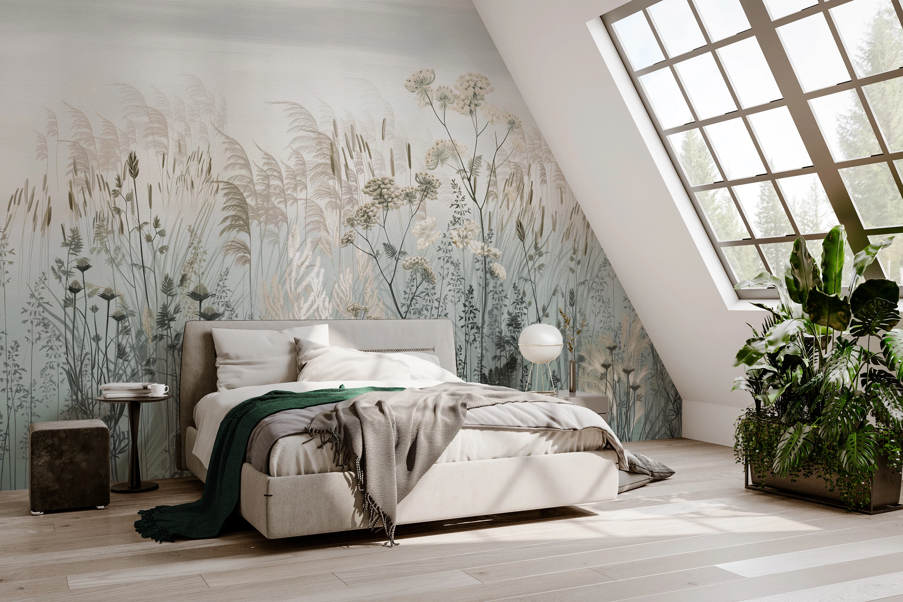 Ilustracja przedstawia subtelną łąkę pełną traw i polnych kwiatów, ukazanych w pastelowych, lekko przygaszonych barwach. Delikatne kłosy i drobne kwiatostany tworzą romantyczny, naturalny krajobraz, w którym panuje harmonia i spokój. Kompozycja sprawia wrażenie lekkiej mgły unoszącej się nad roślinnością, co dodaje całości elegancji i klimatu marzeń. Taka fototapeta doskonale ociepli wnętrze i wprowadzi atmosferę relaksu.